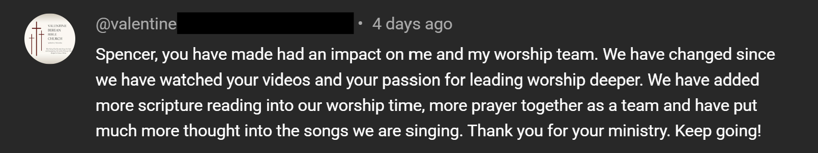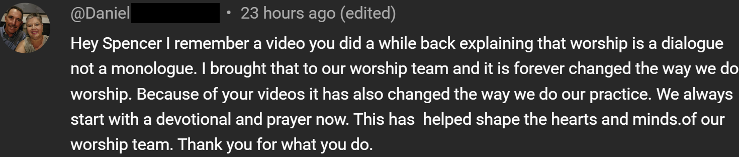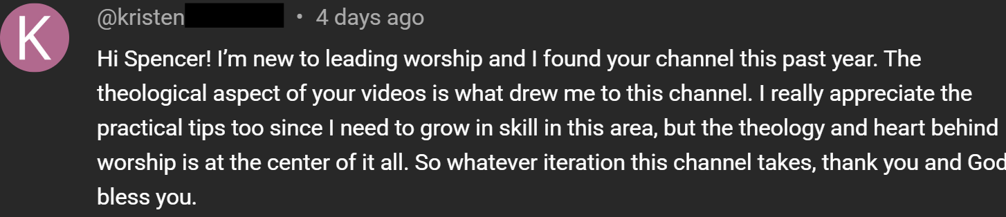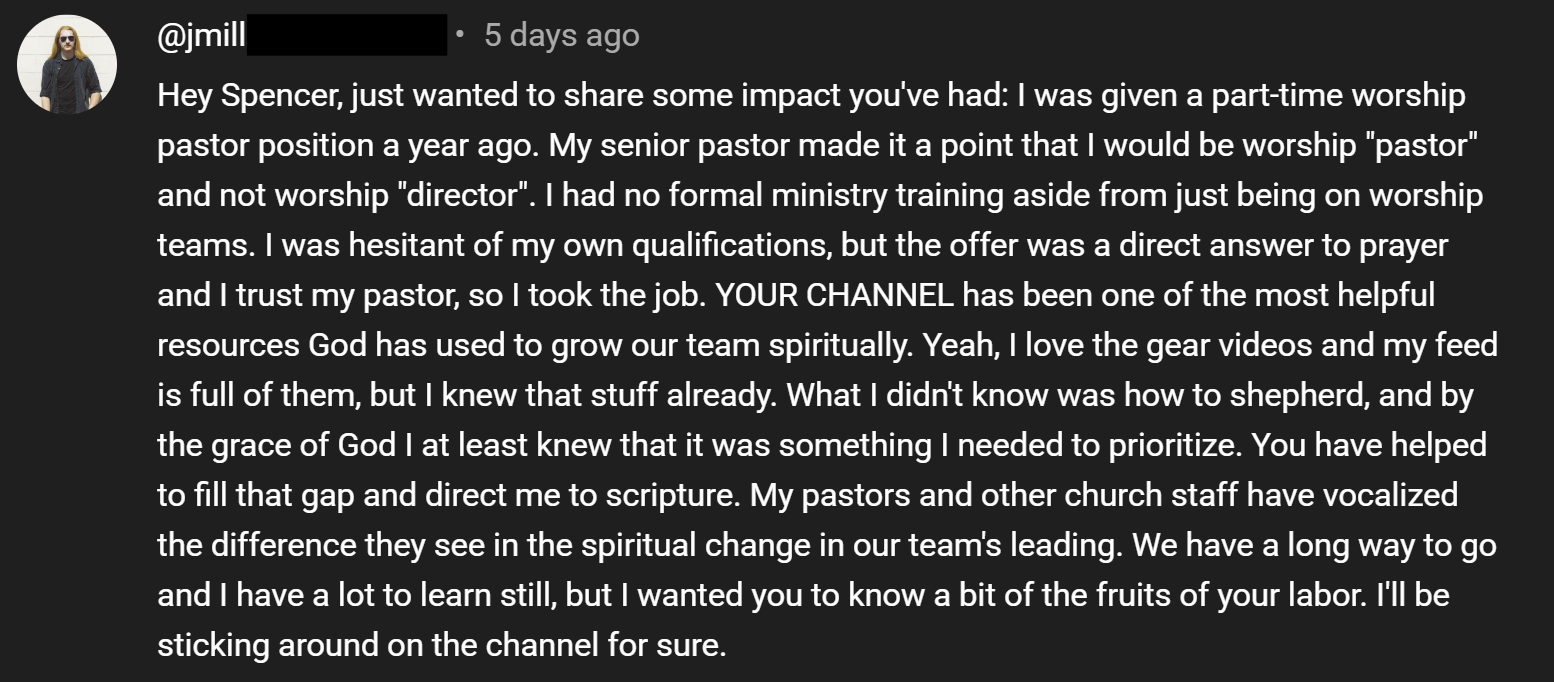 It ensures that I can continue to dedicate myself to making theological content — which does not often get as many views and clicks as “gear videos” but is infinitely more important. When you invest in this ministry, you are investing in the theological training of worship leaders all over the world.